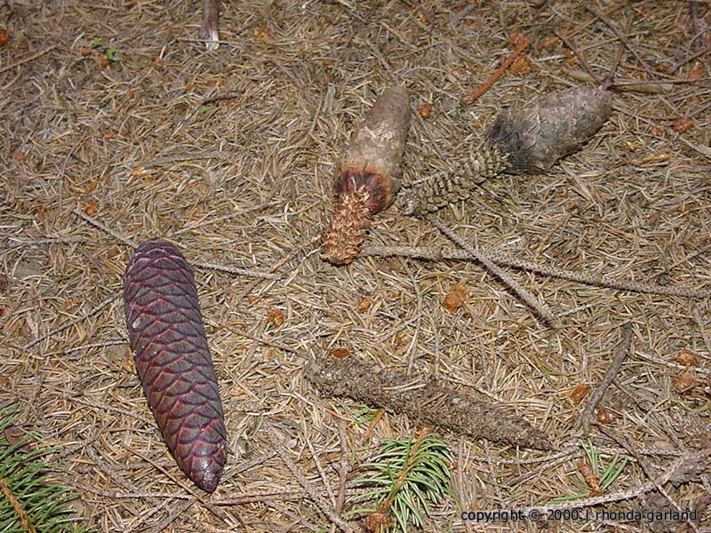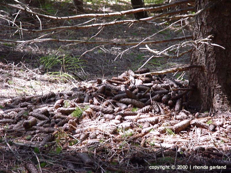 with all the scales and seeds gone (in the photo compare the intact cone on the left to the partially eaten cones on the right). As well, piles of cone scales can be found at the base